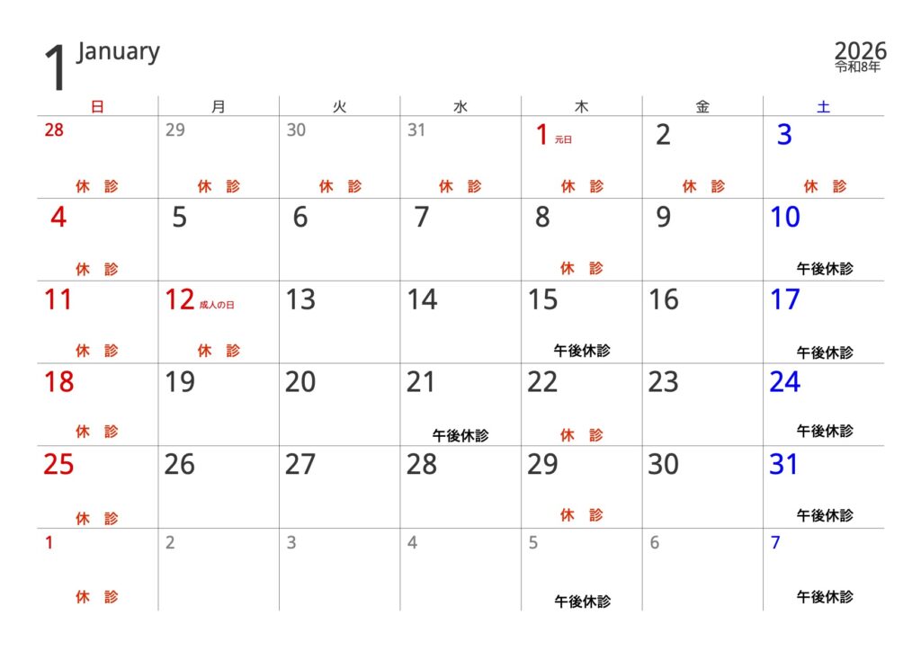 お知らせ ホームお知らせ1月休診日のお知らせ1月休診日のお知らせ 2025.12.29 お知らせ 1月の休診日のお知らせです。年始は1月1日から1月4日まで休診1月8日休診 1月15日午後休診 1月21日午後休診 1月22日休診 1月29日休診1月10、17、24、31日午後休診 1月11、12、18、25日休診