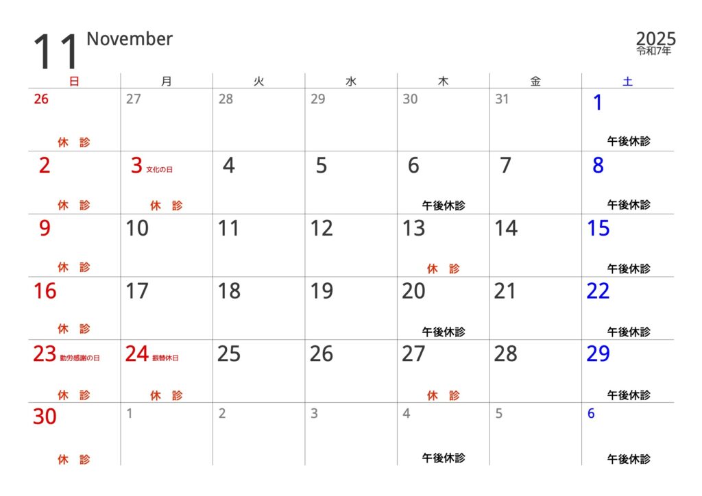 お知らせ ホームお知らせ11月休診日のお知らせ11月休診日のお知らせ 2025.10.29 お知らせ 11月の休診日のお知らせです。11月6日午後休診11月13日休診11月20日午後休診11月27日休診11月1、8、15、22、29日午後休診11月2、3、9、16、23、24、30日休診